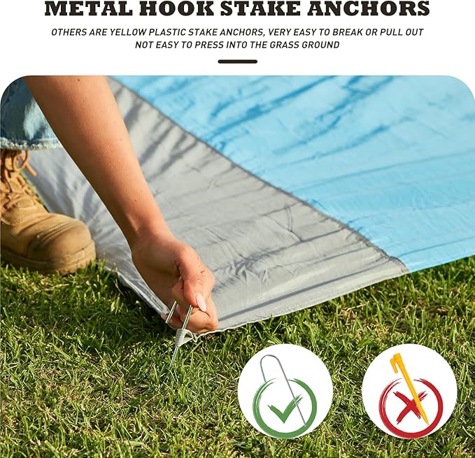- 👍👍WINDPROOF & 100% WORRY-FREE👍👍1) No more plastic stakes, which are very easy to pull out or break. Our beach blanket adopts 4 heavy duty metal stakes, very easy to stake down tightly into the beach or ground. 2) Plusing four triangle corner sand pockets, this outdoor blanket is absolutely 100% windproof. Simple yet practical. 3)100% Satisfaction! Please feel free to contact us!