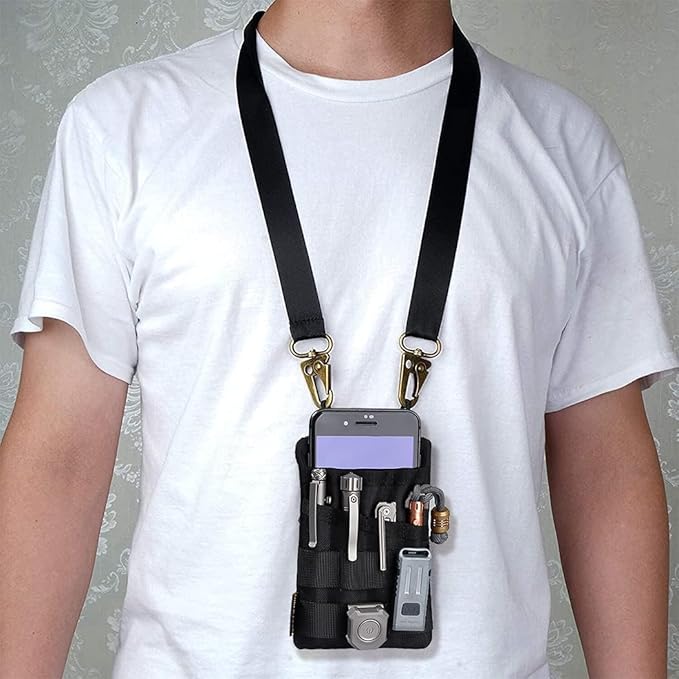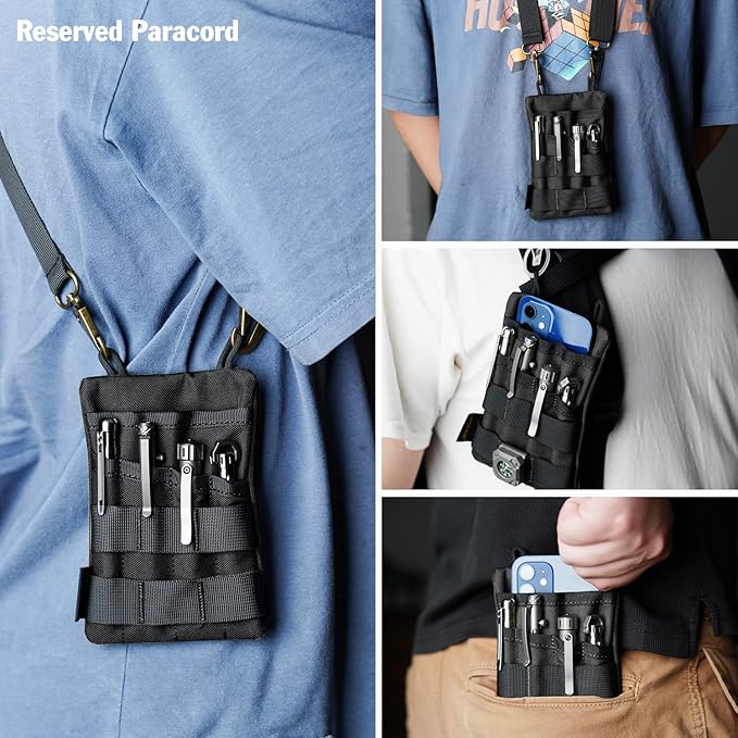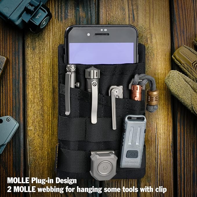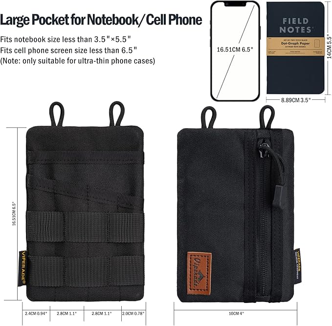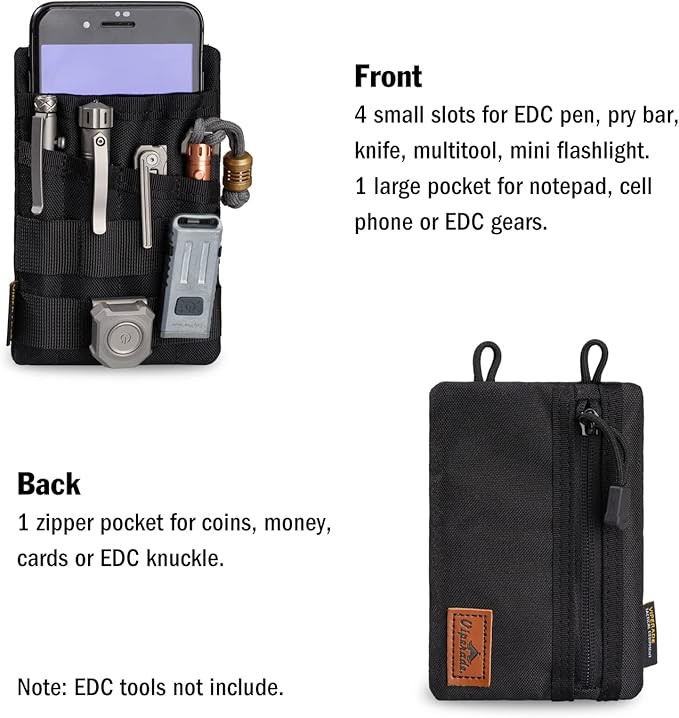 - 【High Capacity】Pocket tool organizer has four accessory pockets and a zipper pocket on the back, which can hold mini flashlights, folding knives, tactical pens, larger multi-tool and other EDC gear. The large pocket at the top usually holds a 3.5''*5.5'' notebook or your cell phone(Screen Size ≤6.5’’). MOLLE plug-in design can hold tools with pocket clips, which greatly saves space.