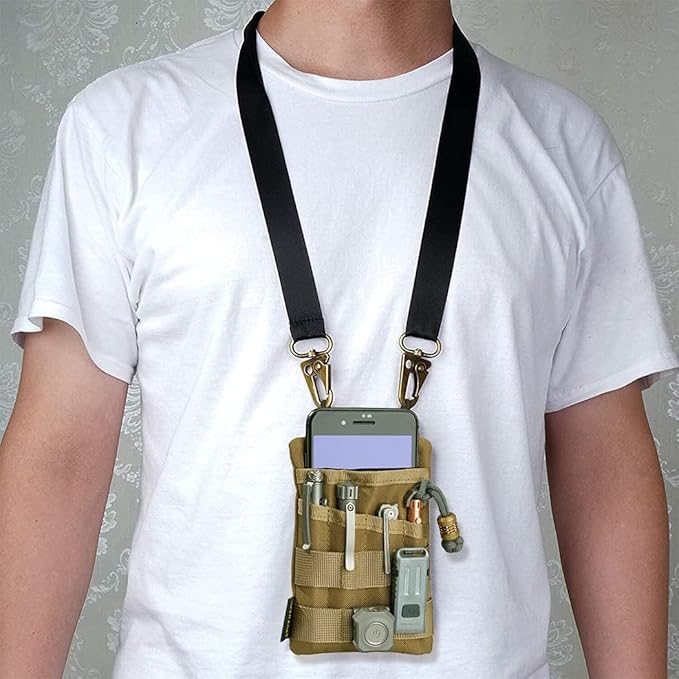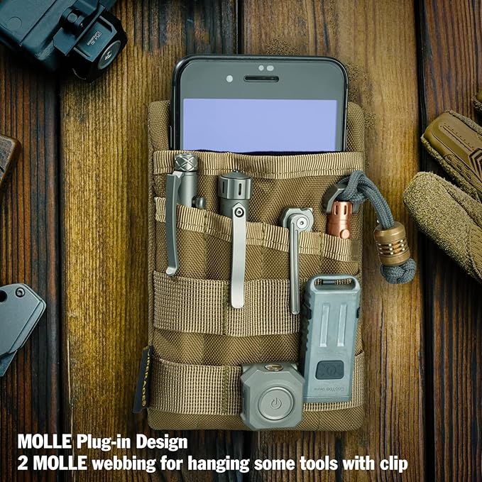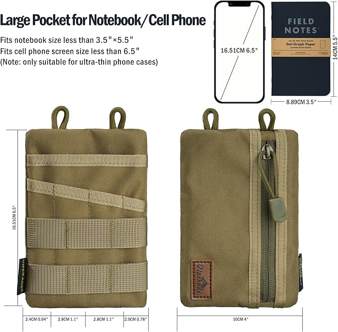 - 【High Capacity】Pocket tool organizer has four accessory pockets and a zipper pocket on the back, which can hold mini flashlights, folding knives, tactical pens, larger multi-tool and other EDC gear. The large pocket at the top usually holds a 3.5''*5.5'' notebook or your cell phone(Screen Size ≤6.5’’). MOLLE plug-in design can hold tools with pocket clips, which greatly saves space.