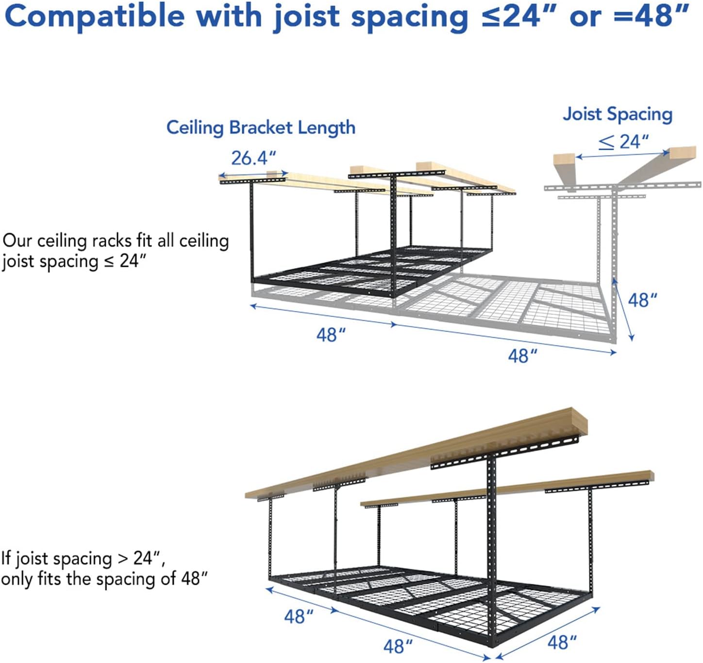 - DIY INSTALLATION:Installation template helps make plan.This overhead storage rack fits all ceiling joist spacing ≤ 24",if joist spacing > 24",only fits the ceiling spacing of 48".