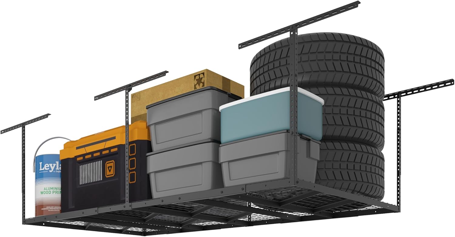 - 1600 lbs Tested, 800 lbs Rated: Our overhead garage storage rack undergoes rigorous double load testing (1600 lbs) to ensure unmatched safety and durability, supporting up to 800 lbs for your tools and equipment.