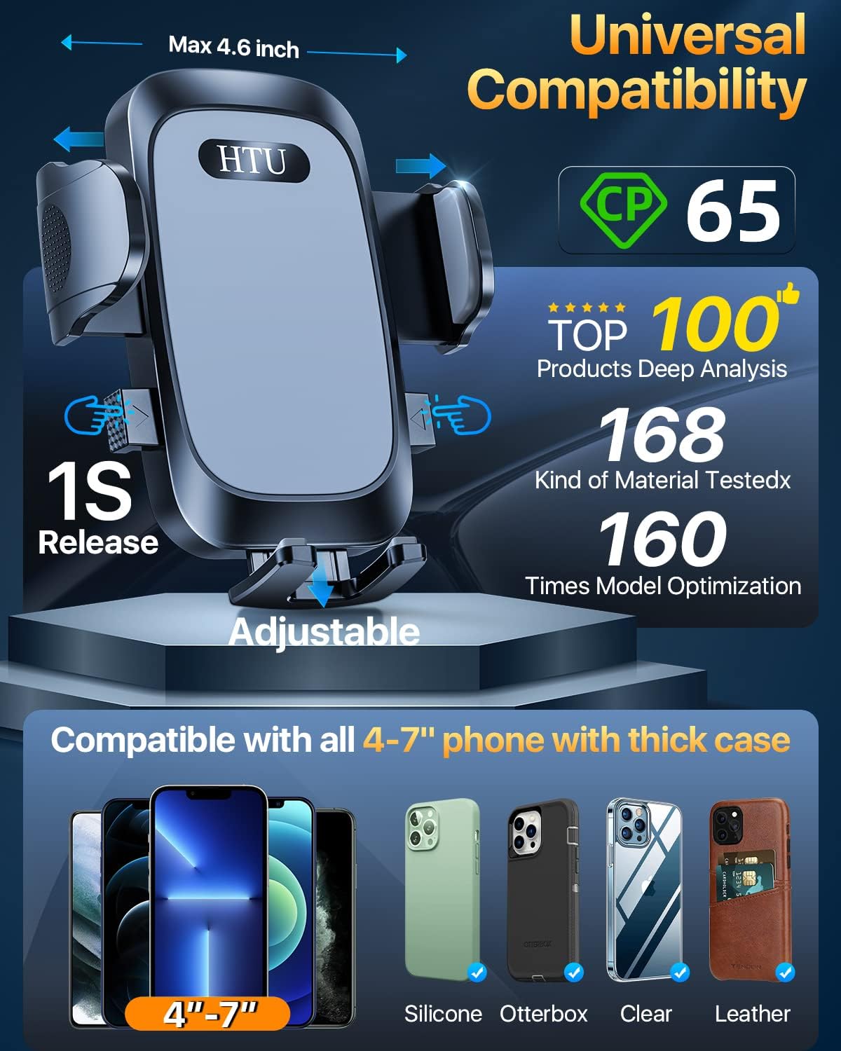 - [Good Choice: High-End Car Mount Trusted by 2,500,000+ Users over 15 Years] 2024 HTU car phone holder is certified by all authorities (International Military-Grade Shockproof Cert , CP65, REACH, RoHS), based on Unique Grandmaster Design (EUIPO Patent), TOP Durable & Healthy Materials from 4,000+ materials & Industry-Leading Safety Tests (Monthly 5,000+ open/close test; 10,000+ vibration resistance; 100,000+km rugged road tests; -40°F to 203°F laboratory test)