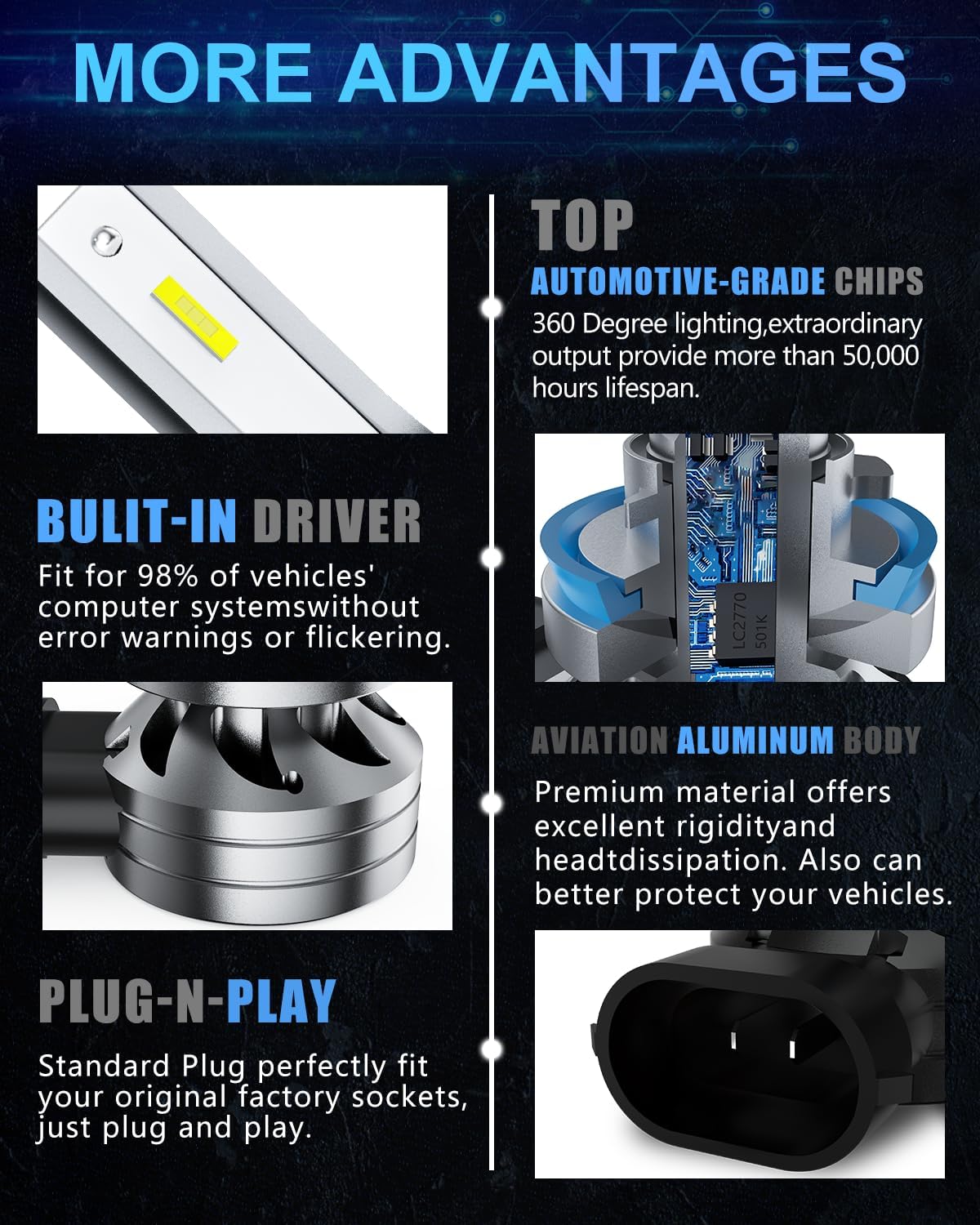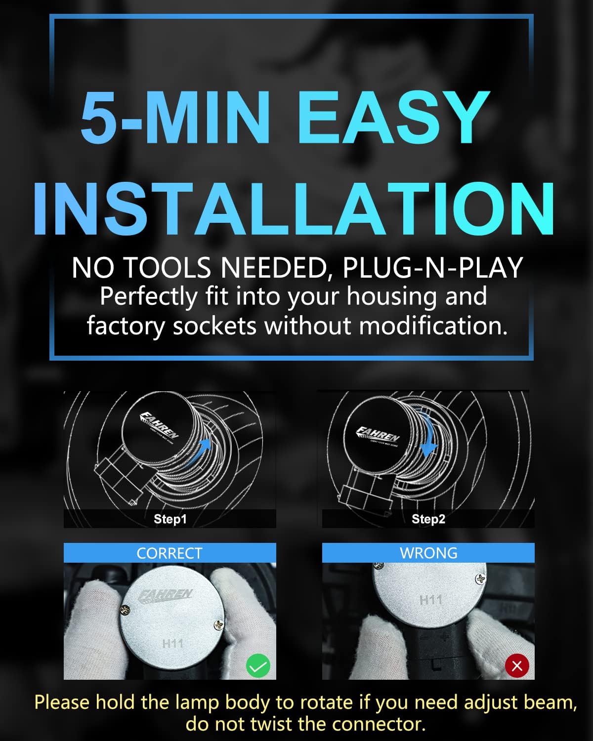 - 【WIRELESS DESIGN】Wirless and design of H11 LED makes installation easier and also provides more space for heat dissipation. Please hold the lamp body to rotate instead of the connector to prevent damage.