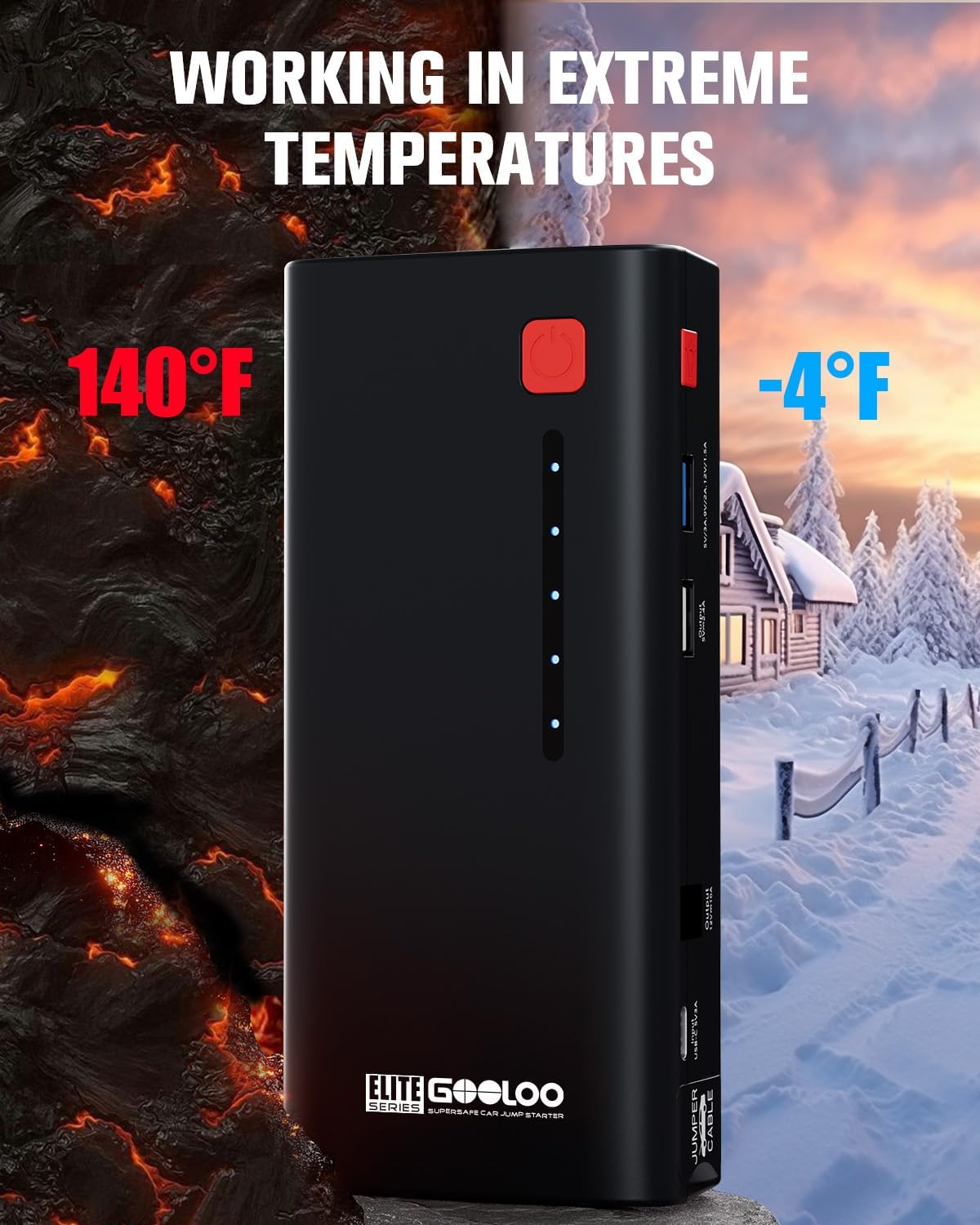 - AFFORDABLE AND POWERFUL- Get an all-in-one car bettery starter, power bank and LED flashlight at an affordable price. The performance of this GOOLOO portable car battery jump starter power pack was just as capable as many of the high-end model and can meet the needs of most people.