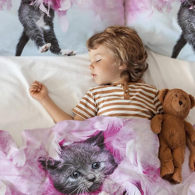 Yasida Cat Comforter Set Queen Size for Kids Pink Feathers Black Cat 3Pcs Bedding Set for Boys and Girls (1Comforter+ 2 Pillowcases) Lovely Animal Pets Comforter Set