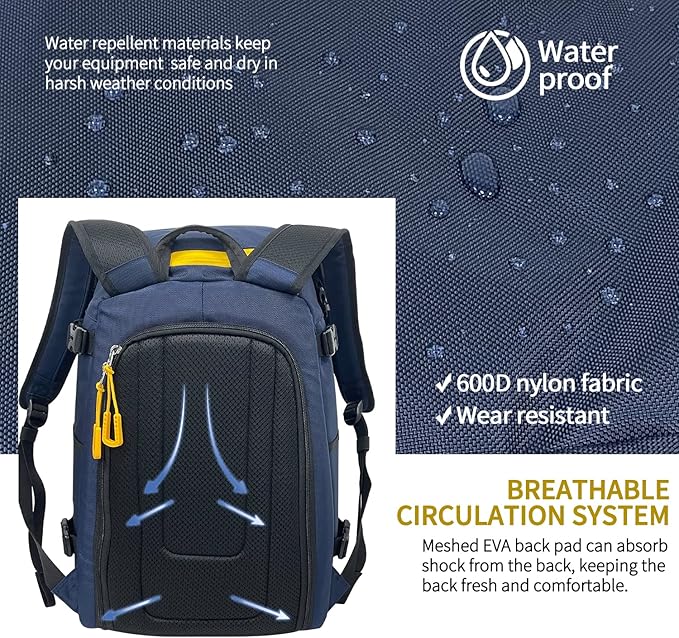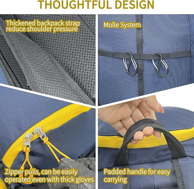 - 1680D nylon fabric with excellent water repellency and abrasion resistance is adopted, tarpaulin bottom with four foot pads prevents snow getting into the backpack.