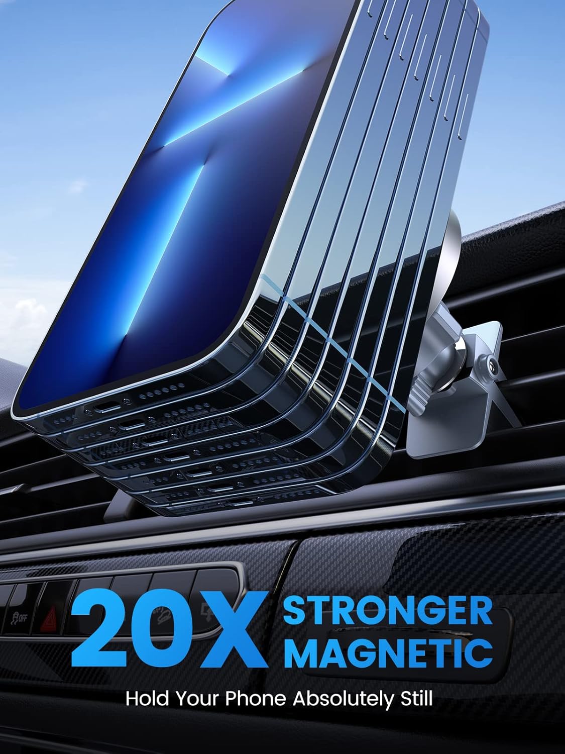 - [Strongest Magnetic=100% Lock Your Phone] Our cell phone holder car magnetic built-in 12 wider & bigger N52 magnets, provides strong magnetic power and is 50X stronger than official magsafe car mount. This magnetic car mount keeps your phone secure & stable even on big potholes and speed bumps roads. The closed magnet field won't impact your phone signal at all. With this car phone mount magnetic, feel free to use navigation or other functions normally & smoothly.