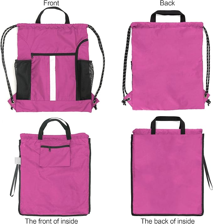 • Handle Design and Reflective Strip:Our draw string back pack bag has 2 handy carry handles allow for hand holding or hang it on the wall or door, very convenient for your use. Also the extra verticle reflective strips can enhance the high visibility to ensure your safe while in dark or dusk. Greatly reduce your chance of being hit at night.