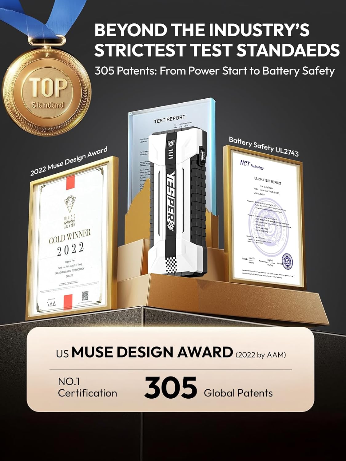 - Multiple Charging Methods -- The car jump starter power pack built-in USB(5V/2.4A), USB QC(5/9/12V) and Type-C(5V/3A) input/output ports, which can efficiently charge various electronic devices such as mobile phones, laptops and iPads, making it ideal for traveling or camping; and a DC (15V/10A) port to power any DC device, such as tire inflators, car vacuum cleaners, car refrigerators, etc