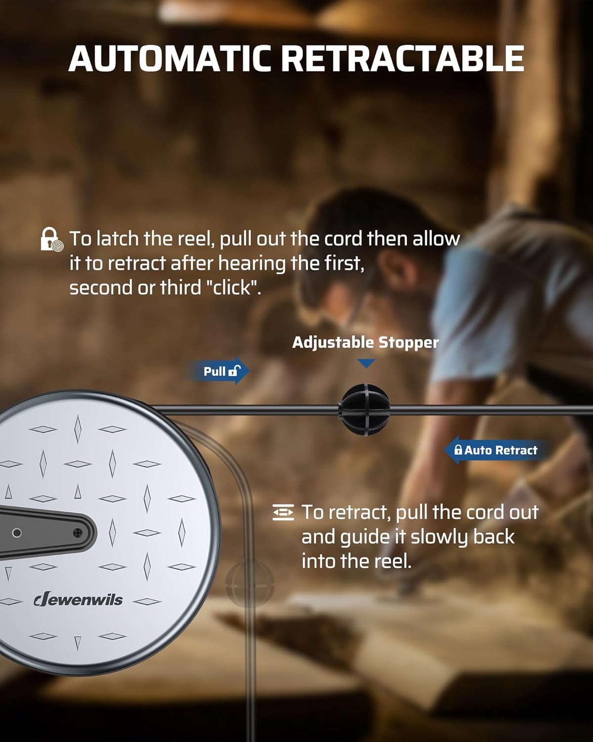 - [Automatic Retractable] The auto-guide rewind mechanism of this retractable power cord reel ensures the cord retracts smoothly without any annoying kinks or tangles; the ratcheting system allows you to lock the cord at any length, making it a breeze to quickly store away once you're finished