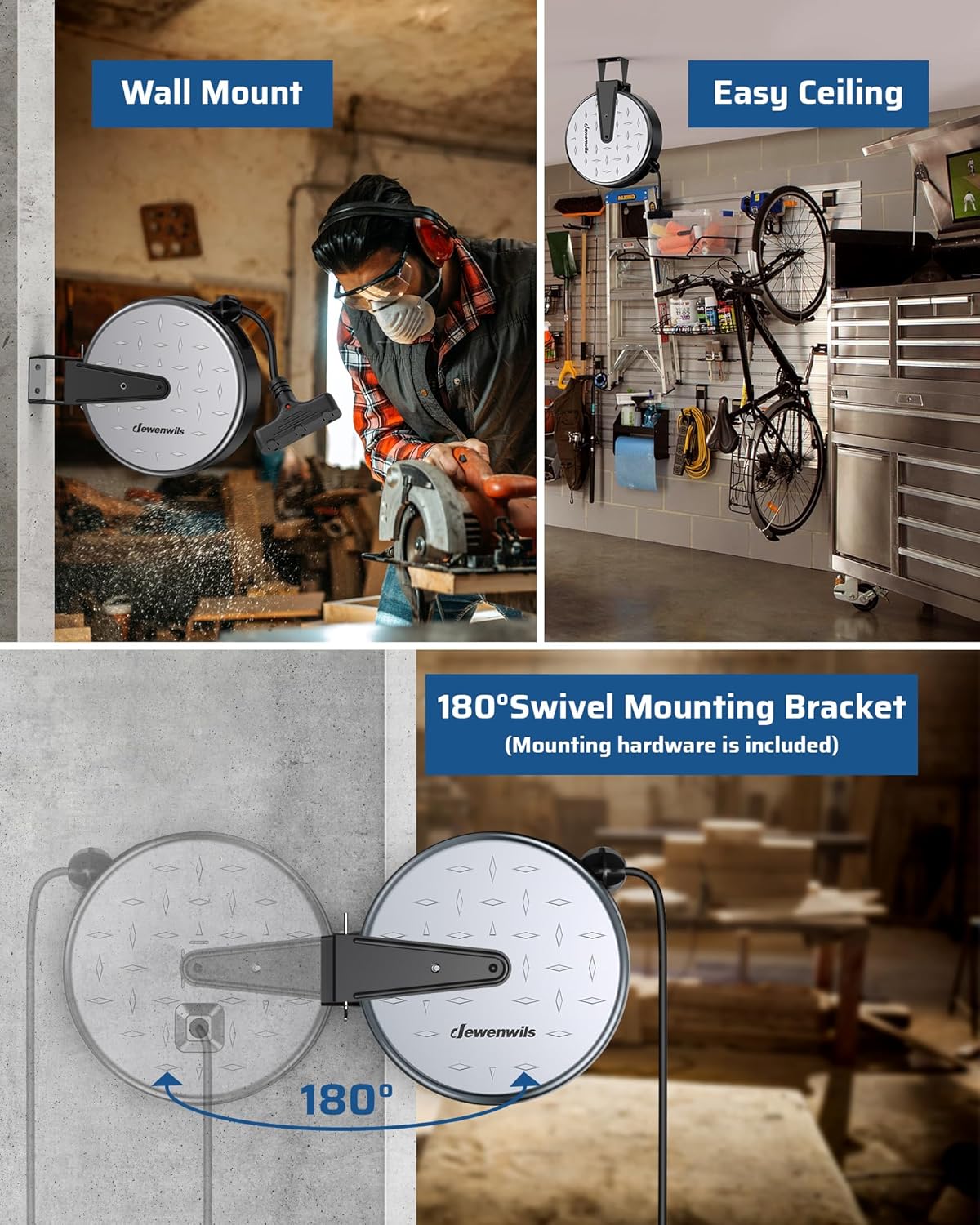 - [Easy to Install] Equipped with 2 mounting screws and 1 bracket, this retractable power cord reel is easy to assemble with few minutes; the spin mount bracket allows the cord reel to rotate smoothly up to 180 degrees, ideal for suspending from your garage/ workshop roof or fastening onto a wall