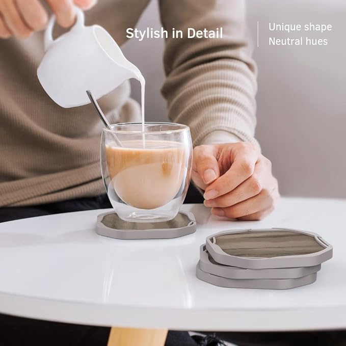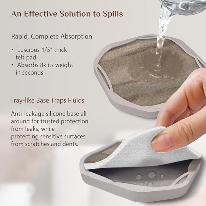 - RESPECT WOOD - Featuring material mashup, it effortlessly protects your table - all day, every day [ Safe from Spills and Permanent Damage ] The 1⁄5" thick felt pad can absorb as much as ¼ cup of liquid in seconds, and the silicone base offers leak-free protection while protecting your sensitive surfaces from scratches and dents [ Elevated Experience ] The embossed geometric pattern enhances grip without leaving residue while keeping air circulating to make the coaster easier to pick up