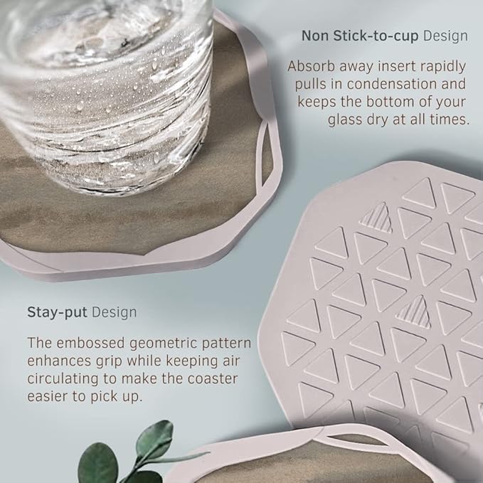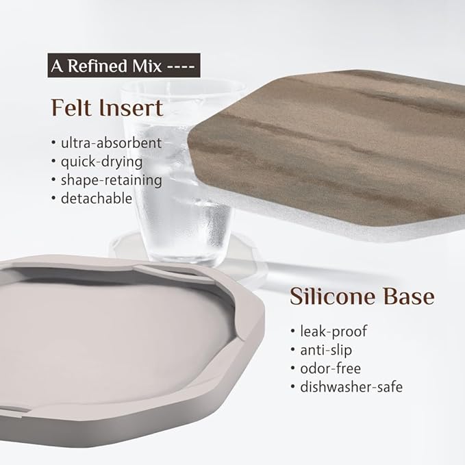 - HYBRID SILICONE AND FELT - It combines the best of both materials for a lightweight yet durable, all-purpose coaster. The non-slip silicone base keeps your cups in place while the super absorbent felt pad soaks up any moisture from your glass. In addition, the case has a lip with charming reliefs around the edges, which nicely frames the tailored insert, preventing it from popping up