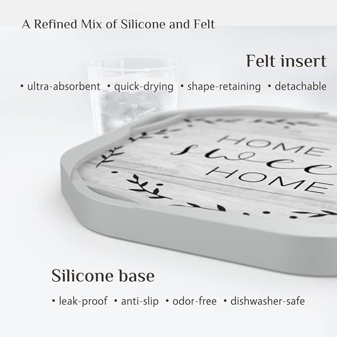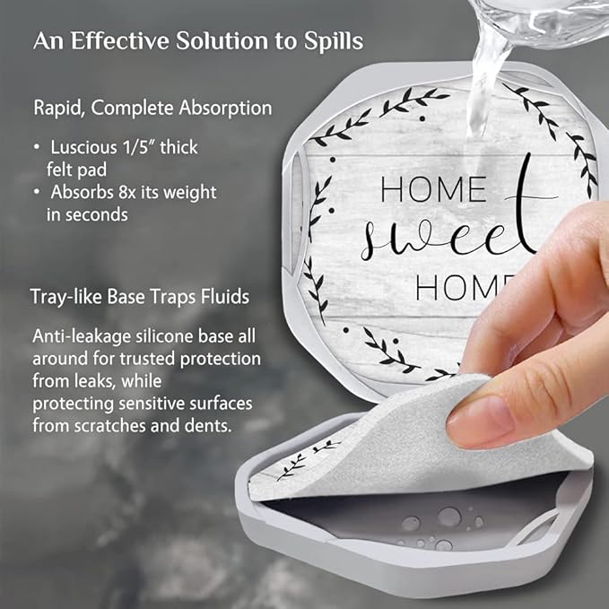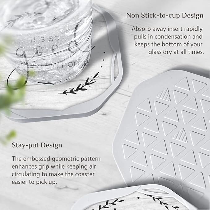 - HYBRID SILICONE AND FELT - It combines the best of both materials for a lightweight yet durable, all-purpose coaster. The non-slip silicone base keeps your cups in place while the super absorbent felt insert soaks up any moisture from your glass. In addition, the decorative case has a pretty lip with charming reliefs around the edges, which nicely frames the tailored insert, preventing it from popping up