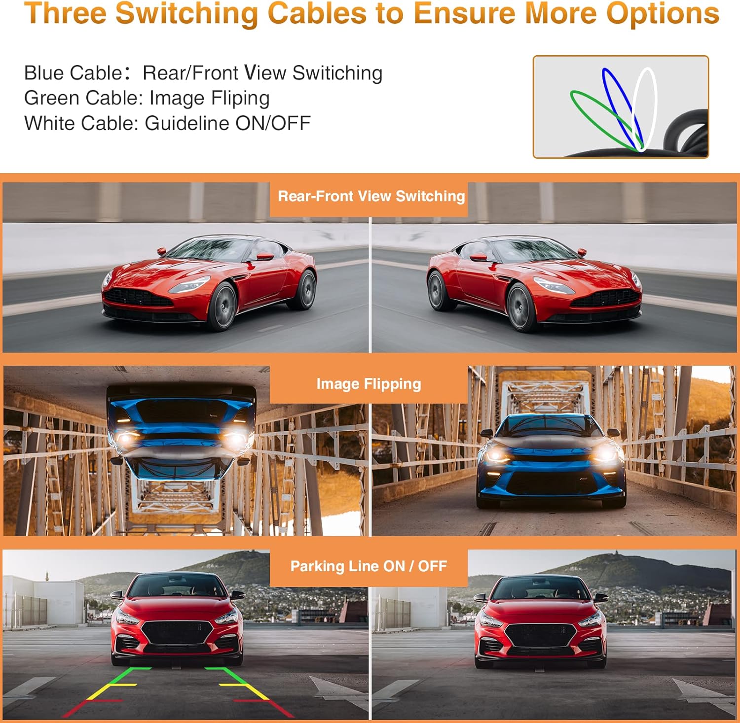 - Multifunctional Backup Camera for Car: The camera can be toggled to mirror, flip the image, and close the stop line by cutting the blue, green, and white loops. It can be installed in multiple positions such as the rear roof, above the license plate, rear bumper or front grille to solve the installation needs of different positions.