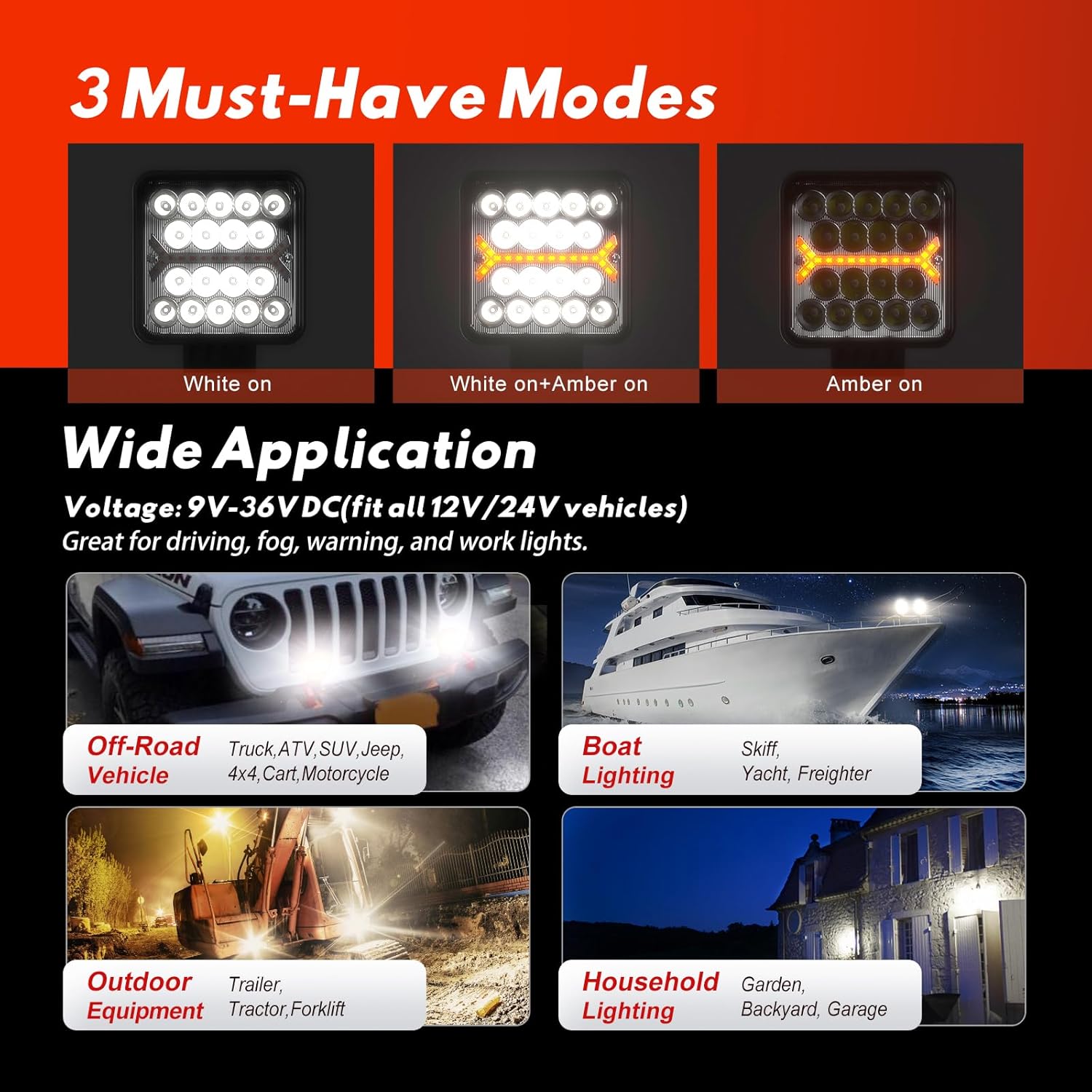 - 【3 Must-Have Modes】 Each mode(white on/amber on/white on&amber on) is a must-have use for fog, driving, warning, exterior, backup, bumper, and work lights as cars, trucks, trailers, motorcycles, boats, or RVs universal accessories. 18 white light and 18 amber light LED chips with hemispherical design, no lighting waste