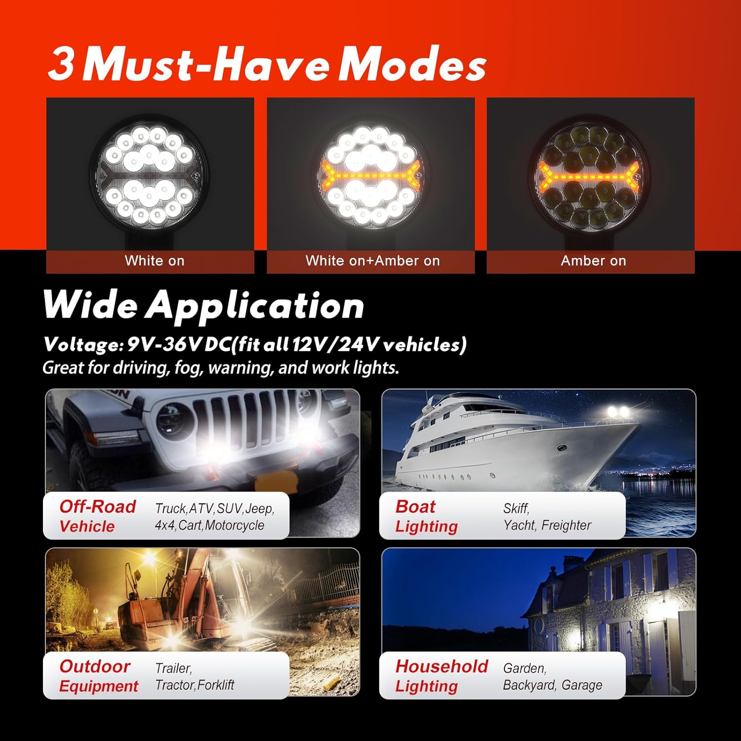 - 【3 Must-Have Modes】 Each mode(white on/amber on/white on&amber on) is a must-have use for fog, driving, warning, exterior, backup, bumper, and work lights as cars, trucks, trailers, motorcycles, boats, or RVs universal accessories. 18 white light and 18 amber light LED chips with hemispherical design, no lighting waste