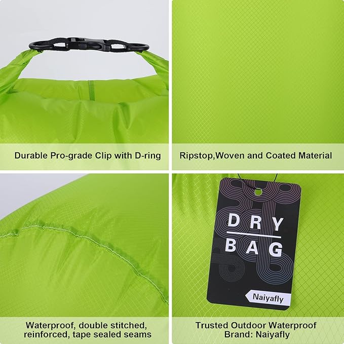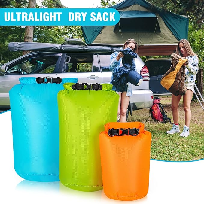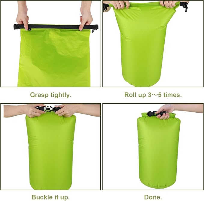 - 【Easy Operation and Cleaning】Just put your gear in bag, grab top woven tape and roll down tightly 3 to 5 times and then plug buckle to complete seal, whole process is very quick. Our camping dry bag set is easy to wipe clean due to its smooth surface.