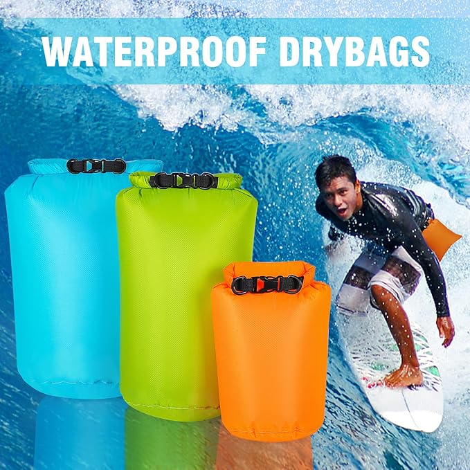 - 【Various Sizes and Colors, Keep Your Gear Organized】3-Pack,5L(Orange)+15L(Green)+30L(Blue), different sizes waterproof dry bag can meet your different needs. We also paired it with strap and storage bag, perfect for food, clothes, hats, important item, all of the outdoor gear.【PLEASE NOTED THESE DRY BAGS CAN'T BE USED AS WATERPROOF PHONE CASE!】