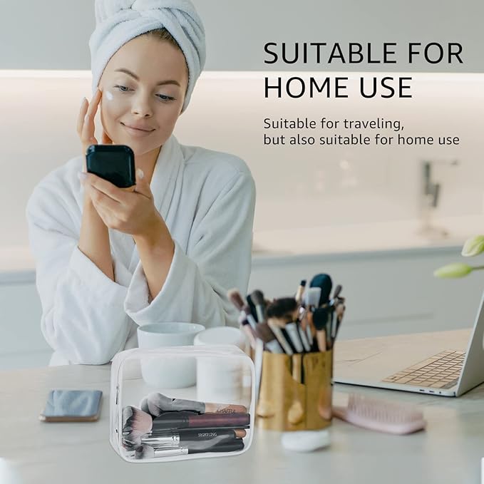- Improved 0.6mm thickened transparent PVC material, softer and more pliable, durable and reusable; 3 PACKS 3 DIFFERENT SIZES: 1x Large clear toiletry bag (11.8" x 3.9" x 8.7"), 1x Medium clear makeup bag (9.5" x 1.9" x 7.9"), 1x Small clear cosmetic bag (7" x 1.6" x 5.5")
