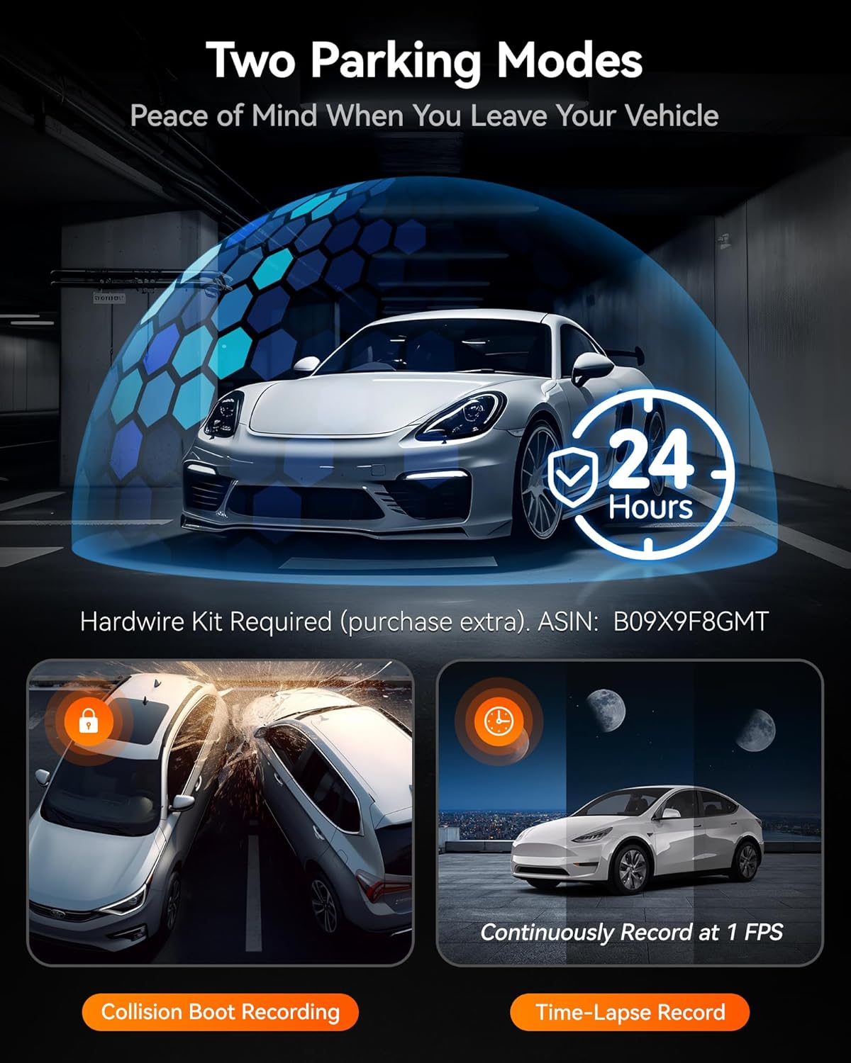 - [Triple Parking Modes for 24/7 Protection] The WOLFBOX on-dash mounted 3-way Cameras have Dual Parking Monitoring Modes: "Collision Boot Recording" and "Time-Lapse Record." Collision Boot Recording records when an impact is detected, while Time-Lapse Record captures 24-hour timelapse footage when you are away. Note that Collision Boot Recording does not work in Time-Lapse Mode.