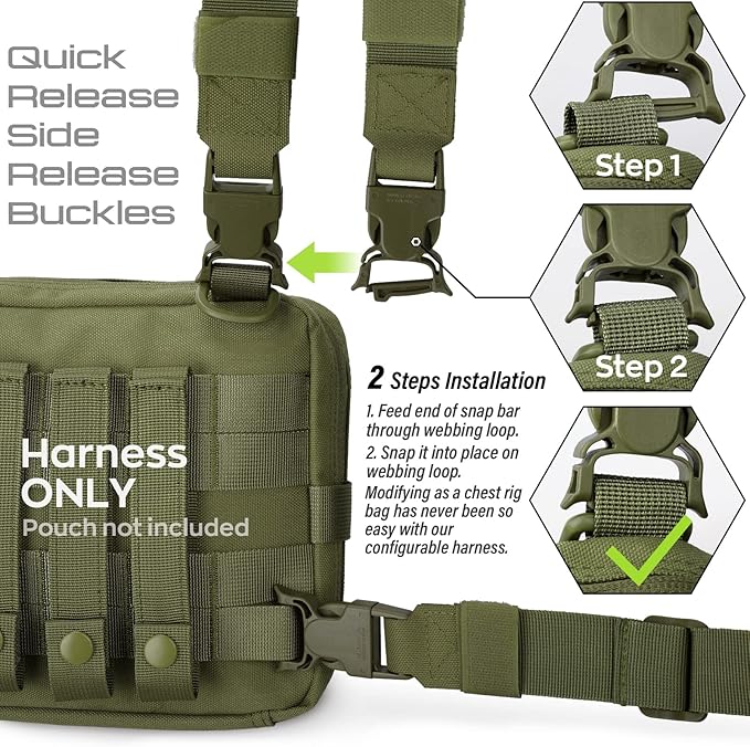 - EASY TO ATTACH: Tactical Suspender adopt the snap bar buckle and just run it through the top D-ring webbing loop, and the rear Molle webbing of your tactical admin pouch/chest bag, then deadly snap into place or side-release to take off, easy to fits 1"/25mm webbing and standard Molle webbing.