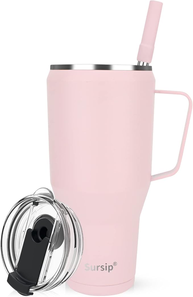 Sursip 40 oz Insulated Tumbler with Screw Lid - Stainless Steel Vacuum Cup with Straw and Handle, Keeps Drinks Cold up to 24 Hours - Sweat/Leak Proof, Dishwasher Safe, Fits Car Cup Holder (Pink)