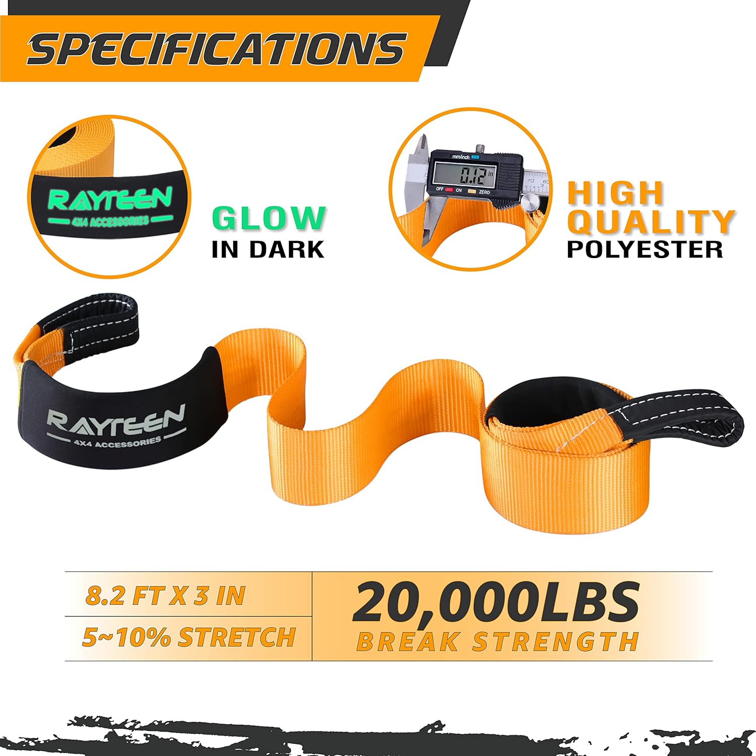 - 【INCLUDES & WARRANTY】1x RAYTEEN tree saver/equalizer strap(8.2ft x 3in); 1x 33,000lbs Tow Strap(20ft x 4in); 1x instruction manual; 1x recyclable printed box with professional safety precautions. LIFETIME WARRANTY.
