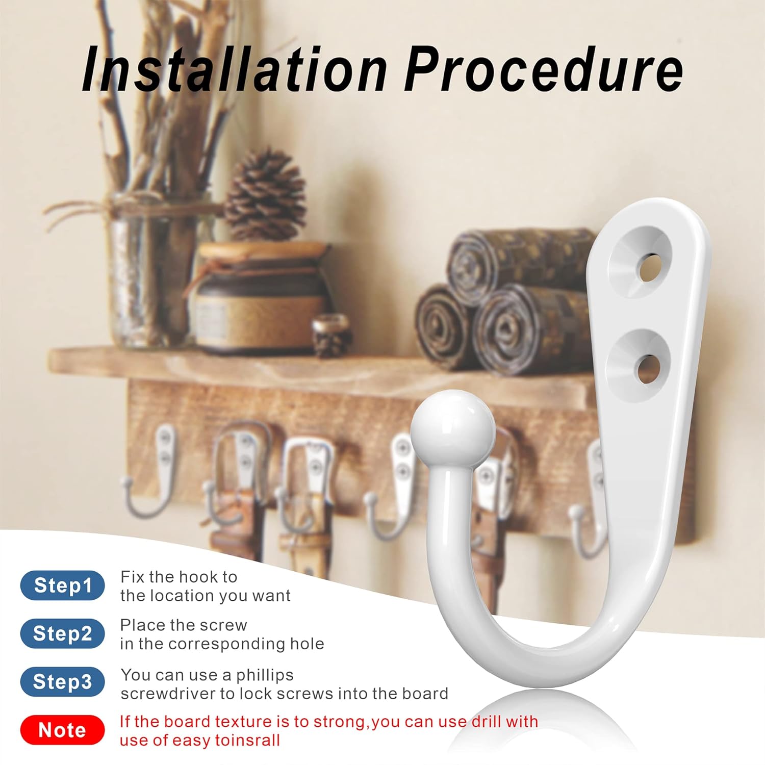 - Size: The Wall mounted hook dimension is 1.72 x 1.18 inches, medium size, Length of screws: 14mm, the diameter of screw head: 6mm