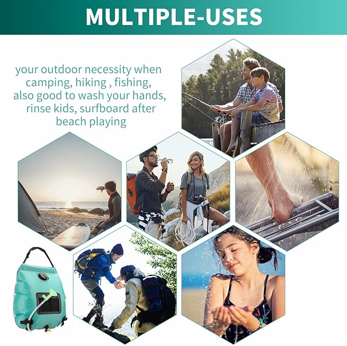 - WIDE RANGE OF USES - This camping showers is suitable for outdoor activities such as camping, backpacking, hiking, fishing or hunting, our portable shower bag is one of the indispensable outdoor equipment accessories for you and your family.It is also the best gift for Father's Day and the perfect camping accessory for men your husband and your children.