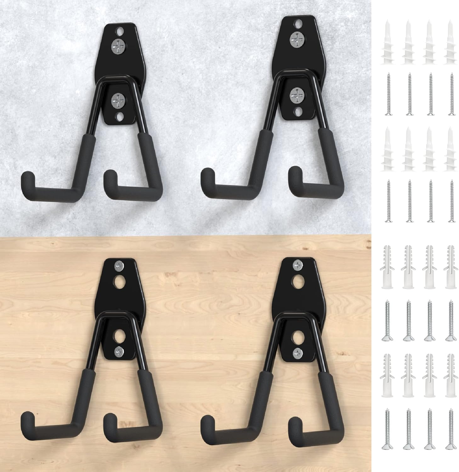 - [Multi-application] We adapt different anchors for the garage hooks to fit various walls. You can wall mount the garage wall hooks on brick/ concrete/ wood wall or plaster board as your storage need.