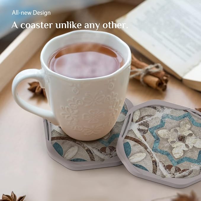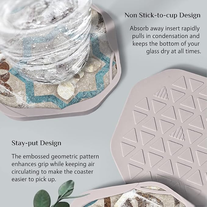 - HYBRID SILICONE AND FELT - It combines the best of both materials for a lightweight yet durable, all-purpose coaster. The non-slip silicone base keeps your cups in place while the super absorbent felt insert soaks up any moisture from your glass. In addition, the decorative case has a pretty lip with charming reliefs around the edges, which nicely frames the tailored insert, preventing it from popping up