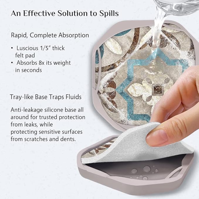 - RESPECT WOOD - Featuring material mashup, it effortlessly protects your table - all day, every day [ Safe from Spills and Permanent Damage ] The 1⁄5" thick soft felt pad can absorb as much as ¼ cup of liquid in seconds, and the silicone base offers leak-free protection while protecting your sensitive surfaces from scratches and dents [ Elevated Experience ] The embossed geometric pattern enhances grip without leaving residue while keeping air circulating to make the coaster easier to pick up