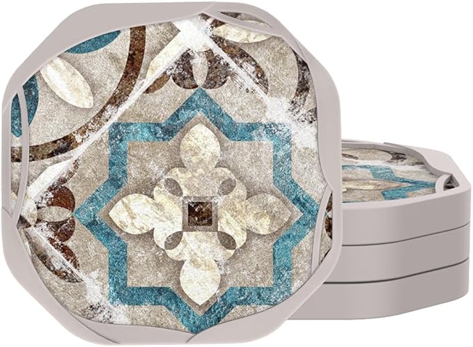 UMIRRO Absorbent Coasters for Drinks, Rustic Retro Silicone Cup Coaster with Felt Insert for Coffee Table Decor, Boho Vintage, Small Birthday Gift Ideas for Men Dad Him Women Mom Her, 4", Set of 4
