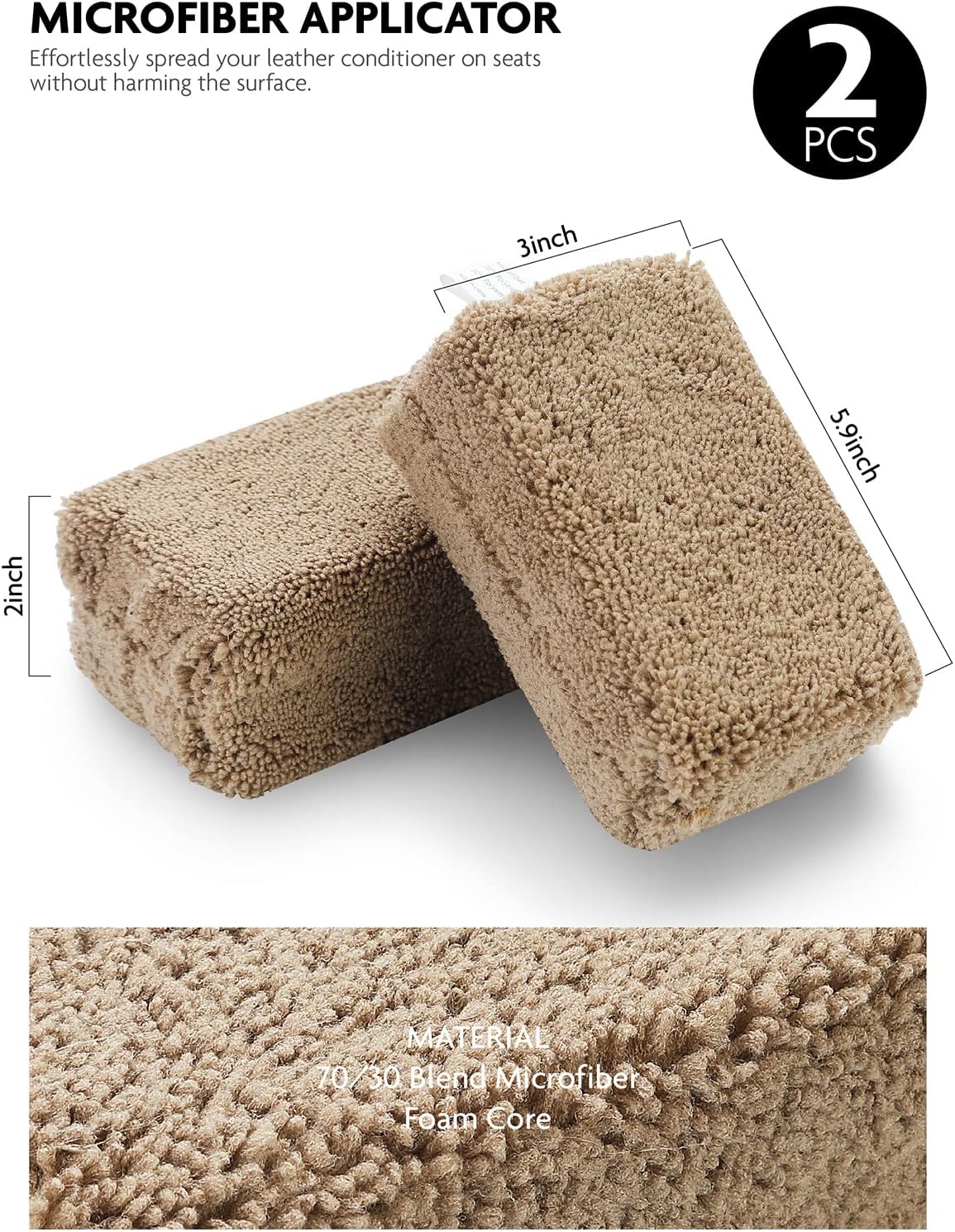 - [ Premium Grade Microfiber Applicator] The microfiber applicator pad is perfect for conditioning and protecting leather seats and upholstery in any fine vehicle. Made with 70/30 blend microfiber that stay soft through dozens of wash and dry cycles. With a thick foam core inside that feels plush and firm in the hand, and ensures even coverage over leather