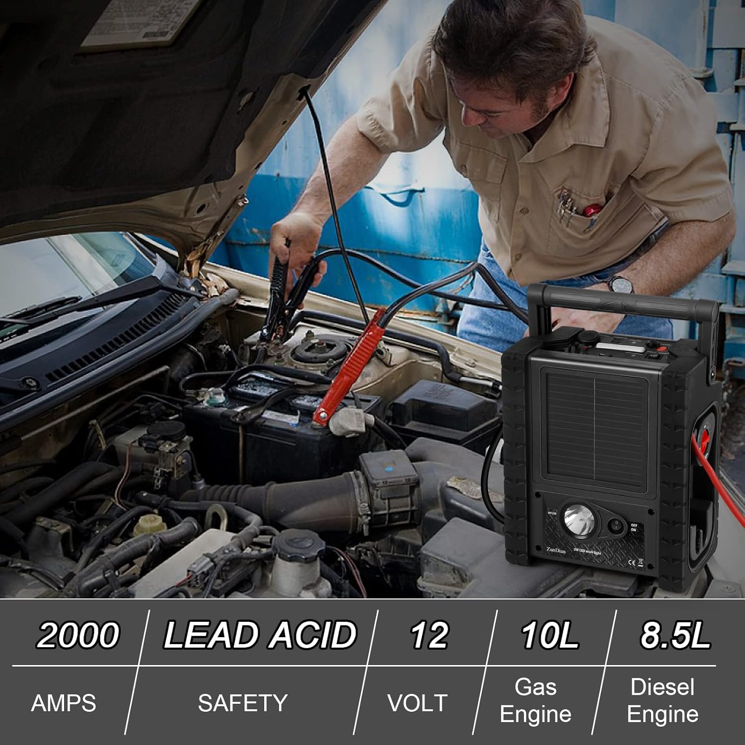 - Jump Starter with Air Compressor -- ZunDian jump starter built-in Air compressor pump (35 L/Min, 260 PSI) with a digital LCD that reads the current tire pressure, taking only 5 mins fully pump. Also comes with 3 adapters valves for your bikes, cars, balls, pool toys, and other Inflatables.