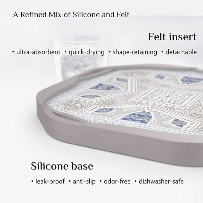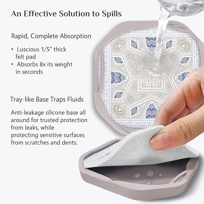 - HYBRID SILICONE AND FELT - It combines the best of both materials for a lightweight yet durable, all-purpose coaster. The non-slip silicone base keeps your cups in place while the super absorbent felt insert soaks up any moisture from your glass. In addition, the decorative case has a pretty lip with charming reliefs around the edges, which nicely frames the tailored insert, preventing it from popping up