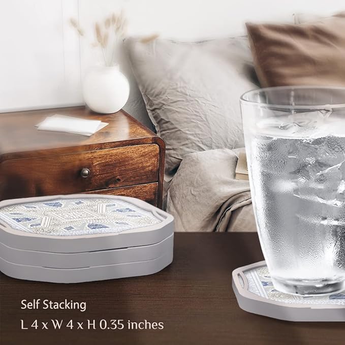 - FUNCTIONALITY - Avoid condensation rings, drips and puddles on tabletop; Prevent sticking, sliding, skidding and leaving marks or stains; Reduce excess noise for a quieter; Non-breakable, reusable, and washable; Protect counters, wooden desks, bedside furniture, nightstands in your apartment or house from scratches; Slip resistant on various surfaces like countertop or desktop which made of marble, stone, slate, ceramic, leather, agate, sandstone, geode, rubber, plastic, cork, or bamboo