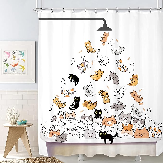 SVBright Cute Cat Shower Curtain for Kids Children 72Wx72L Inch Funny Cartoon Animal Raining Colorful Hilarious Lovely Pets Playing Water Bathroom Waterproof Polyester Fabric Bathtub 12 Pack Hooks