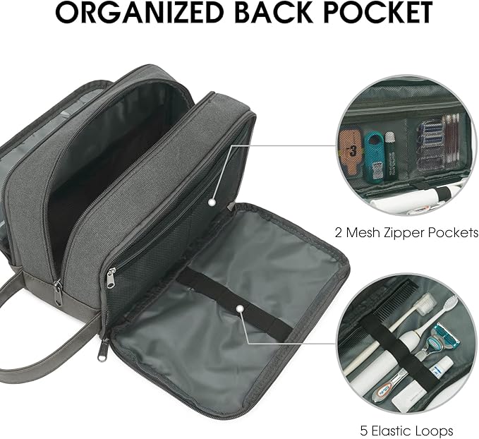 - Organized Back Pocket - The rear pocket opens flat to reveal two mesh zipper pocket for small items like nail clippers, bandages,floss picks or beard trimmer head. Five elastic loops securely hold toothbrushes, grooming tools.