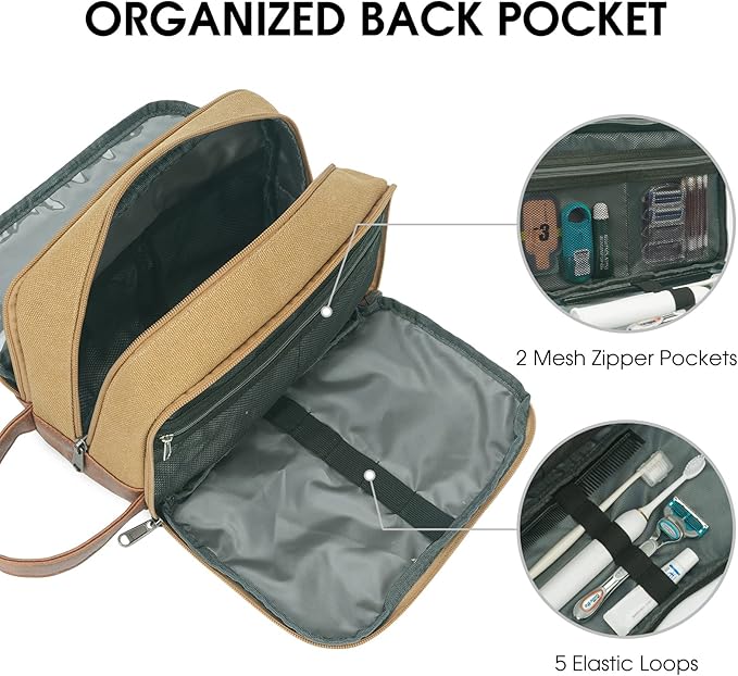 - Easy to Carry - Crafted from durable canvas with PU leather trim, this toiletries bag pairs rugged strength. The water-resistant fabric helps protect your essentials, while the leather handle makes it easy to carry or hang on the go.