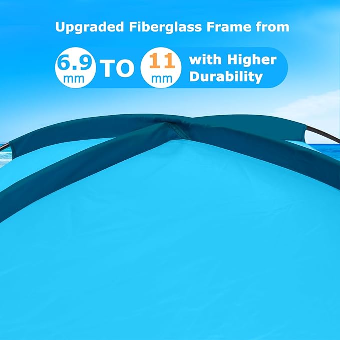 - Thickened Poles for Added Stability: The upgraded fiberglass frame features 11.0mm rods, which are thicker and more sturdy than ordinary beach tents. It supports the beach shelter stably standing by itself and keeps its shape after a long time of use