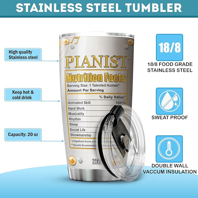 ZOXIX Funny Pianist Nutrition Facts Tumbler Jewelry Style Piano Lovers Gifts For Women Music Themed Coffee Mugs Stainless Steel Cups With 20oz Piano Teacher Mug Pianist Gift