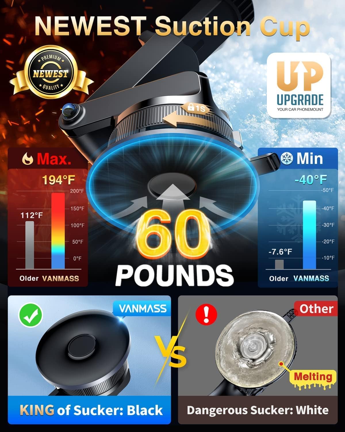 - 【High-end = Quality Materials + Grandmaster Design】VANMASS car phone mount made of PC+ABS material has passed 4 environmental reliability tests and has a temperature resistance range of -40℉ to 194℉, it is also highly resistant to UV rays (Ensuring reliability even in the sun), and the telescopic pole uses a reinforced sliding rail structure to greatly reduce wobbling during driving. This suction phone cradle obtained CP65 / REACH / RoHS safety certifications