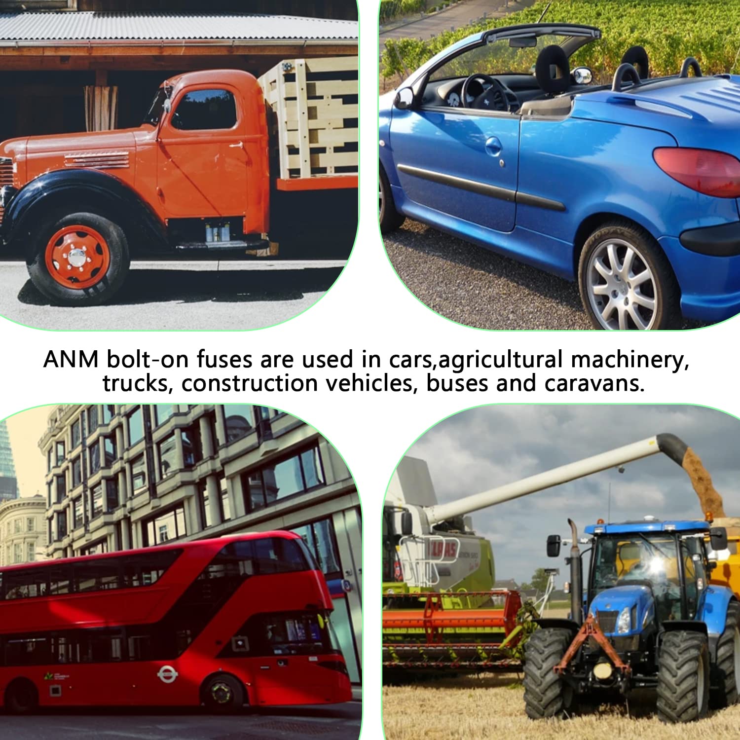 - Application: ANM bolt-on fuses are used in cars, trucks, agricultural machinery, construction vehicles, buses and caravans.