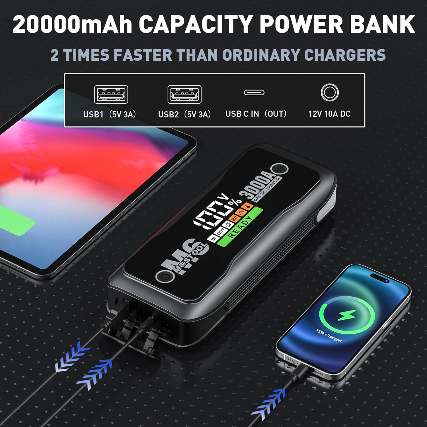 - 🚗 【Power for More Than Just Starting】With a 20,000mAh battery, the MOSTOOL M6 jump starter power pack also serves as a power bank. Dual USB outputs and a 30W PD port provide fast charging for smartphones, tablets, and more. Its 12V-16.8V/10A DC output supports air compressors, inverters, and vehicle accessories. Portable jumper starter functionality goes far beyond emergencies