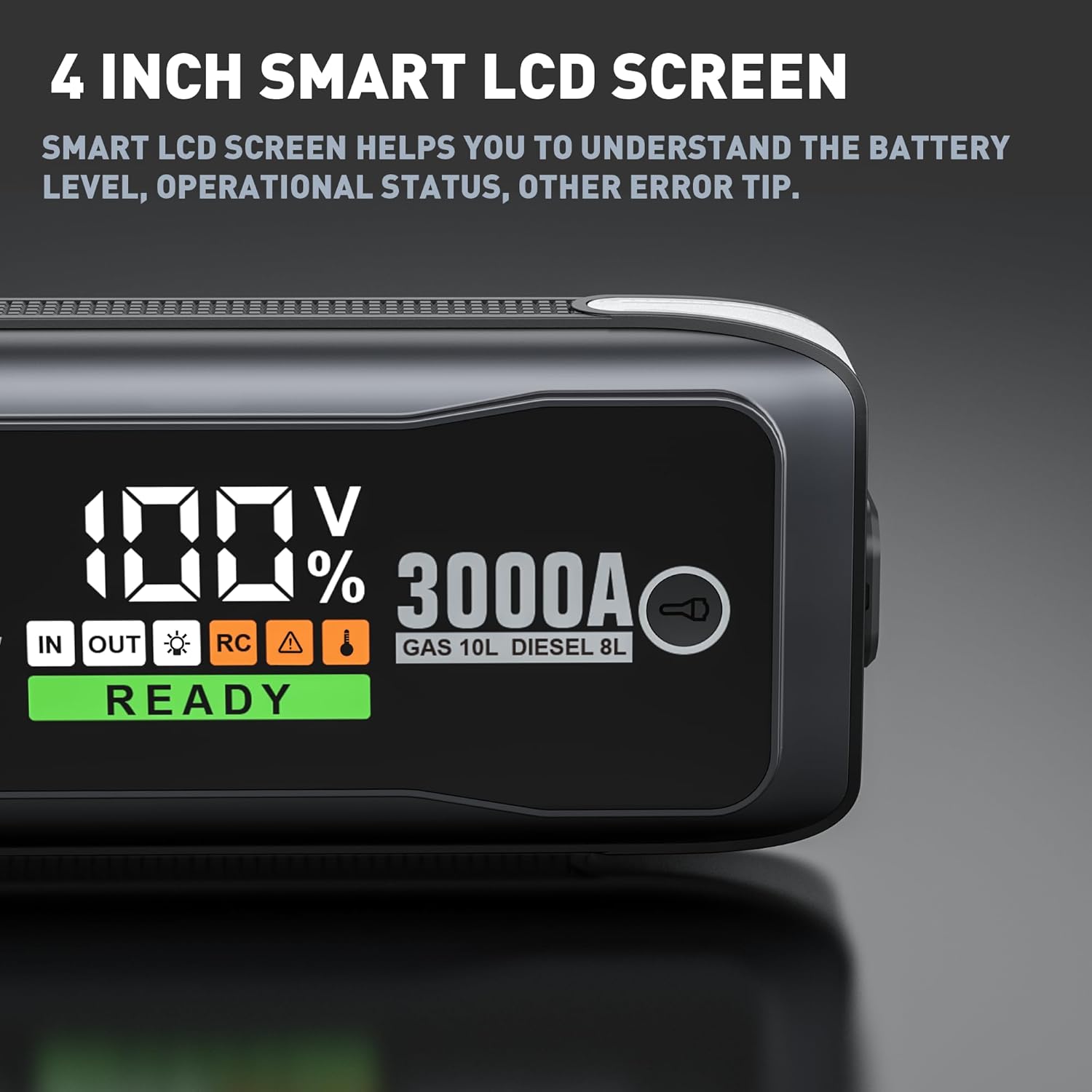 - 🚗【 Light You Can Rely On】Equipped with a 400-lumen LED flashlight and three emergency modes—steady, strobe, and SOS—this compact jump starter ensures visibility in roadside emergencies and outdoor conditions. One-button control makes it easy to operate, while the LCD screen keeps power status clear. A true emergency jump starter with light you can count on
