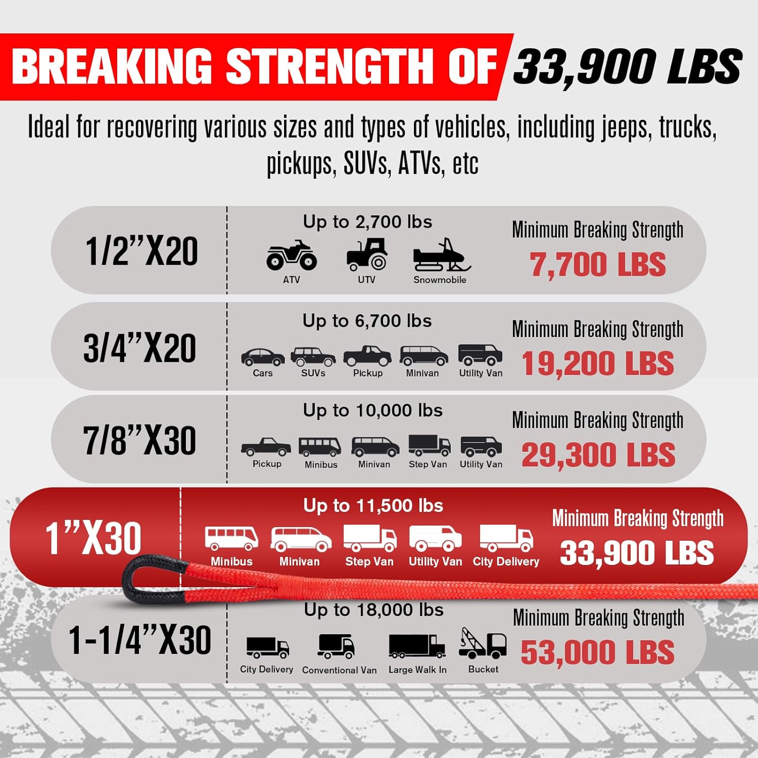 - Superior Toughness: This recovery rope boasts a hefty 33900lbs minimum breaking strength to easily handle your most demanding 4x4 recovery needs. And the double braid nylon tow rope is stronger yet lighter than tow chain of equal strength, which makes the recovery rope ideal for off-road emergency to safely recover and tow your stuck ATV, UTV, snowmobile or SUV out of mud, sand, snow or ditch