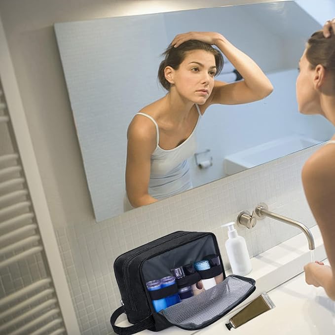 - 【ORGANIZED COMPARTMENTS】 --- Main compartment that holds larger items such as shampoo bottles or shaving cream. One zippered mesh pouch that keeps your smaller toiletries and cosmetics in a place visible and breathable. Other side front zipper pocket that provides extra storage with easy.