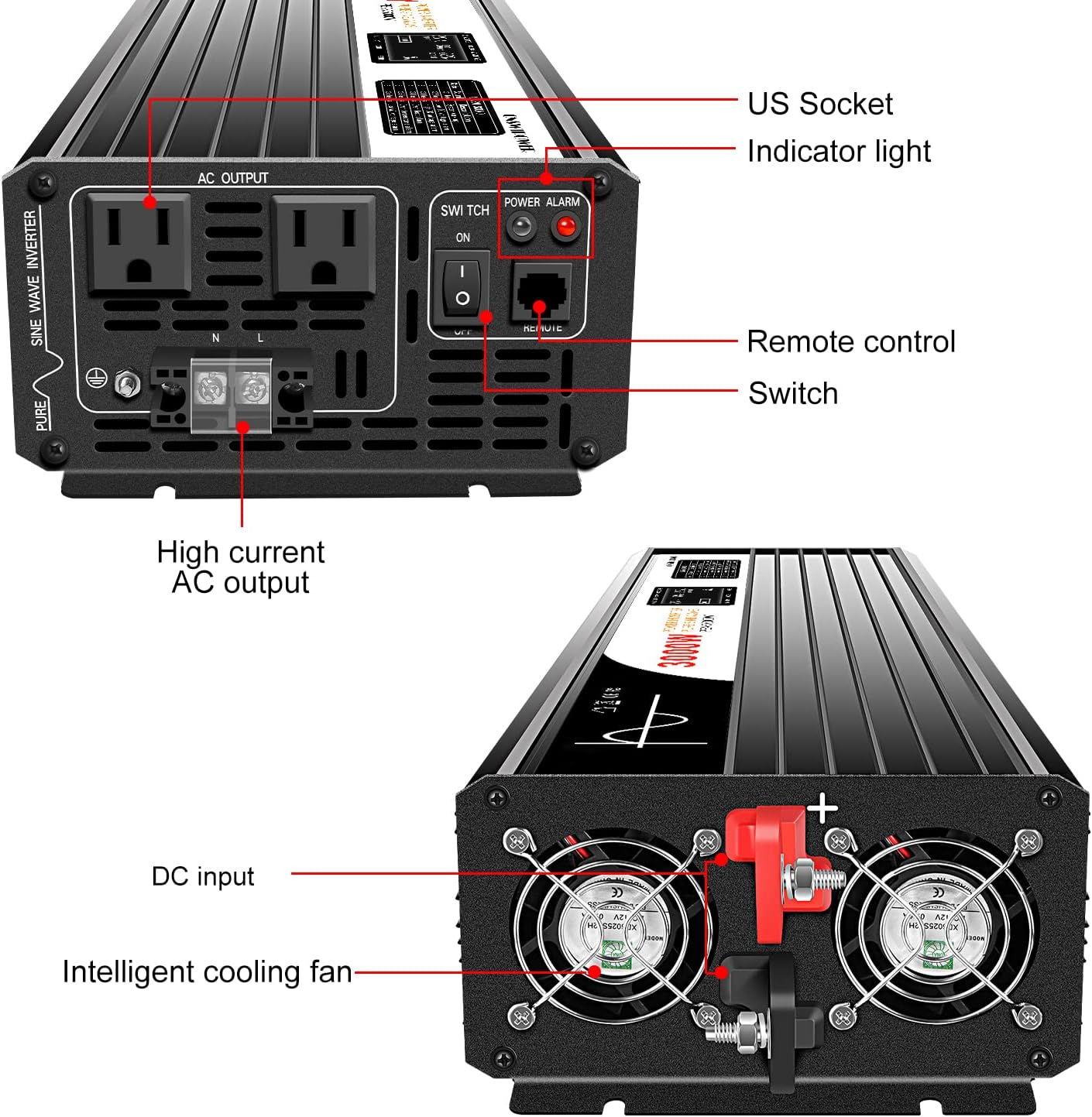 - 【LCD display and remote controlIer】inverter with remote control: The cable is 5 meter long, and the long cable will help you easily control the on/off of the inverter. The LCD display is easy to observe the input voltage, output power .Our inverter with high quality true copper inductance, filter the wave form, ensure the true pure sine wave AC output, safeguard your equipment. All big imported mosfets with strong driving capacity.